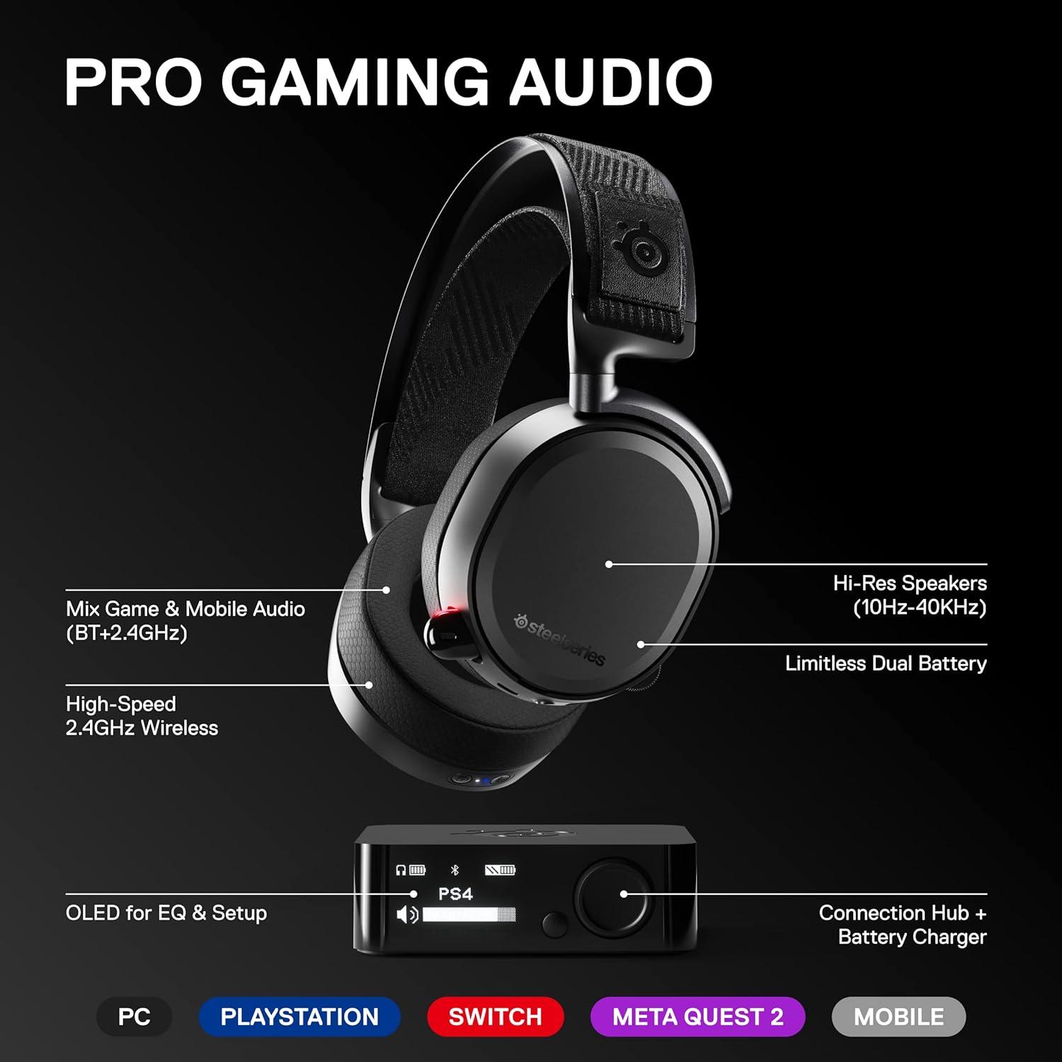 Arctis Pro Wireless features rock solid dual wireless technology with lag free 2.4G wireless lossless audio and Bluetooth mobile audio, combined with 40,000 Hz capable Hi-Res capable speaker drivers and a Clear Cast mic making it the ultimate gaming audio system. Plus, Arctis Pro Wireless is designed with luxury materials like polished steel and aluminum alloy, and the exclusive Arctis ski goggle headband and Airwave performance fabric ear cushions. The multi input wireless transmitter with an OLED screen and included swappable rechargeable batteries make the gaming audio system as flexible as it is powerful.